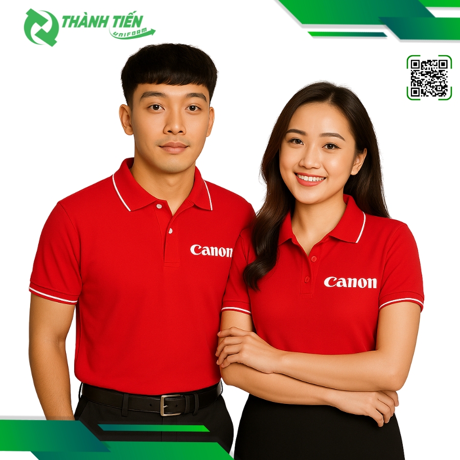 Mẫu áo đồng phục công ty của Canon gây ấn tượng mạnh với gam màu đỏ đặc trưng, chuẩn nhận diện thương hiệu, mang lại cảm giác mạnh mẽ, trẻ trung và năng động. Thiết kế áo polo cổ bẻ truyền thống phù hợp với môi trường công sở, vừa lịch sự, chuyên nghiệp, vừa đảm bảo sự thoải mái khi vận động. Logo Canon được in tinh tế ở vị trí ngực trái, tạo điểm nhấn sang trọng và chuyên nghiệp.