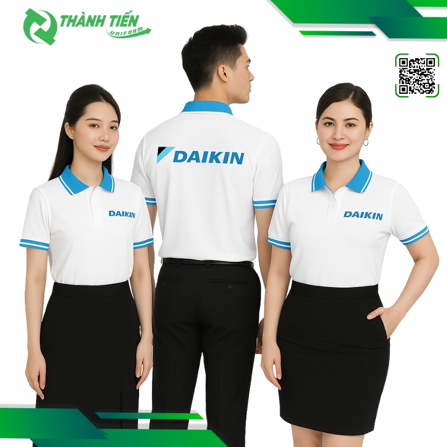 Mẫu áo đồng phục công ty Daikin được thiết kế với phong cách đơn giản nhưng vẫn toát lên vẻ hiện đại và thanh lịch. Áo sử dụng kiểu dáng polo cổ bẻ, đem lại sự chỉnh chu và chuyên nghiệp cho người mặc. Gam màu chủ đạo là trắng kết hợp xanh dương – màu sắc nhận diện thương hiệu Daikin, vừa trang nhã vừa năng động, phù hợp với môi trường làm việc hiện đại.