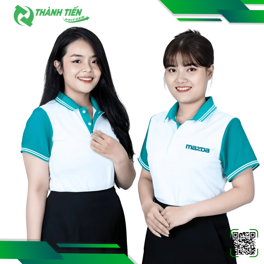Mẫu áo đồng phục doanh nghiệp của Mazda nổi bật với tông màu trắng phối xanh ngọc tươi mát. Thiết kế cổ polo, tay ngắn cùng chi tiết viền sọc trên cổ và tay áo tạo điểm nhấn trẻ trung, hiện đại. Logo Mazda được in nổi bật ở ngực trái, giúp nhận diện thương hiệu dễ dàng và tăng sự chuyên nghiệp cho đội ngũ nhân viên.