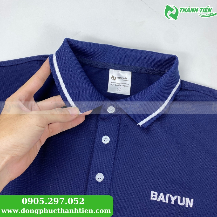 Viền cổ và tay áo màu trắng tạo điểm nhấn tinh tế, nâng tầm thời trang cho chiếc áo. Logo BAIYUN được in hoặc thêu sắc nét và bền bỉ, khẳng định hình ảnh chuyên nghiệp và uy tín của thương hiệu.