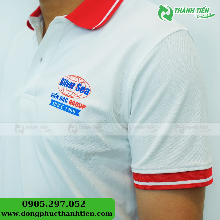 Mẫu áo polo đồng phục Biển Bạc Group được thiết kế theo phong cách hiện đại với tông màu trắng chủ đạo kết hợp cùng viền đỏ nổi bật, tạo nên vẻ ngoài vừa năng động vừa chuyên nghiệp. Phần cổ áo được may kiểu cổ bẻ tinh tế với đường viền đỏ đồng bộ, tay áo ngắn bo viền đỏ, mang lại sự thoải mái và lịch sự khi sử dụng. Logo “Biển Bạc Group” được in sắc nét bên ngực trái, nổi bật và dễ nhận diện, giúp thương hiệu của bạn luôn gây ấn tượng mạnh mẽ.